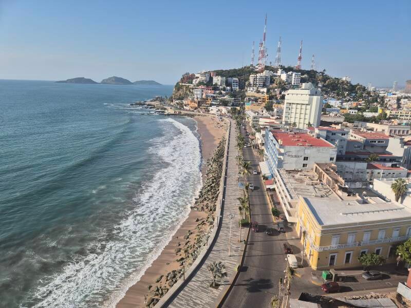 Es ist herrlich warm hier und das wollen wir geniessen. Also geht es gleich wieder los. Natürlich würde ich gerne zum Leuchtturm laufen. Doch ist ein ganzes Stück. Eigenlich keine Sache, wenn nicht die Sonne schon fast untergehen würde. Und so machen wir nur ein Teilstück. Dieser Leuchtturm zählt zu den bekanntesten in Mexiko. Er zählt mit seiner Lage von 152 m.ü.M. als der am zweithöchsten gelegenen der Welt nach dem von Gibraltar. So geniessen wir lediglich bei einer Aussichtsplattform den Sonnenuntergang, die warme Brise und beobachen wie ein grosses Passagierschiff rausfährt. Dann kehren wir auch zurück. Schlendern noch an der Küste entlang bis nichts mehr kommt und kehren zurück. Auf dem Rückweg finden wir dann ein einladendes Cafe. Hier bleiben wir. Trinken und Essen etwas bis wir dann in den späteren Stunden zum Hotel zurück kehren.