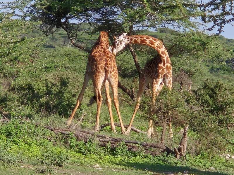 Mit der aufsteigenden Sonne fahren wir Richtung Lake Masek. Unser Plan war als erstes zu den Flamingos. Allerdings kann man die Safari nicht planen und so stoppen wir schon nach ein paar Metern. Zwei junge Giraffen üben ihre Kampftechnik. Das sieht man auch nicht alle Tage. Nun geht es aber wirklich runter zum Wasser. Die Flamingos sind in dieser Jahreszeit eher weiss als Orange. Doch wenn sie Fliegen und ihre langen Flügel ausbreiten kann man die bekannte Flamingo-Farbe wunderbar sehen. Natürlich dürfen die Nilpferde auch nicht fehlen. Dank dem grossen Gewässer können wir die Tonnen-Tiere auch ohne Gestank beobachten. Müde liegen sie im Wasser. Keine grosse Bewegungen oder Aktion. Einfach mit einem schiefen Smilen im Gesicht liegen sie dort.