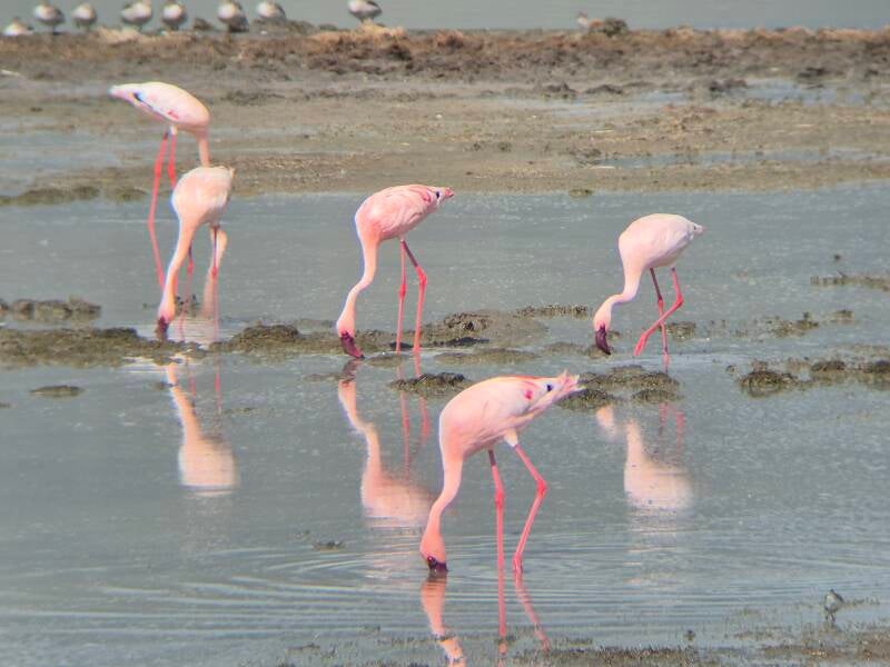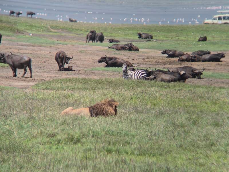 Ich wurde heute wortwörtlich positiv Überrascht. Die Sonne scheint. Es ist warm. Schon mal zwei wichtige Pluspunkte bei mir. Wir sind noch nicht unten, da gibt es bereits einen Halt. Quer über die wiese liegt eine Löwin mit ihren drei Kindern. Süss. Aber zu weit weg um wirklich gute Fotos zu schiessen. Wir haben diese Male über 120 Löwen gesehen, also geht die Fahrt schnell weiter. Unsere Mission: Nashörner. Ohne diese will Martin nicht weg. Im Krater hat man die besten Möglichkeiten diese rare Tierart zu sehen und im Januar sollen sie ja auch relativ nah sein, da es überall ein bisschen Wasser hat. Wir machen ein paar Halts. Büffelherden, Kronenkranich, Gnu und Zebras. Die Flamingos dürfen natürlich auch nicht fehlen. Und dieses Mal sind sie auch ziemlich Pink. Da muss einfach ein Foto in den Kasten. Dann sehen wir eine grosse blechende Schlange von Jeeps. Dort muss ein Highlight sein. Dort müssen die Spitzmaulnashörner sein. Und es sind zweit. Immer noch relativ weit weg. Aber doch die nächsten die wir in der wilden Natur von Tansania sehen. Ein dunkles und ein graues liegen im Gras. Wir verweilen eine ganze Weile hier. Es lohnt sich. Sie stehen auf und marschieren auch etwas. Aber natürlich nicht in unsere Richtung. Schade. Irgendwann nehmen wir dann doch die Fahrt wieder auf. Es geht nicht lange und dann sehen wir wieder in der Ferne viele, viele Autos stehen. Nochmals Rhinos? Nee, Löwen. Auf gehts. Zu meinen Tieren. Doch zuerst machen wir noch einen weiteren Halt. Da ich im Auto stand habe ich zwei Schakale entdeckt. Süsse Tiere. Ein interessantes Schauspiel bekommen wir vor die Augen. Eine ganze Gruppe Hiebeared Füchse jagen sie davon. Diese haben wir noch nie gesehen. Toll. Und dann gehts zu den Löwen. Drei männchen liegen faul im Gras. Kurze Zeit später laufen sie dann davon. Es wäre ein tolles Foto gewesen, hätten sie uns nicht den Hintern gezeigt. Es wird Zeit. Wir gehen Richtung Ausgang des Kraters. Unsere Mission ist erfüllt und wir haben noch einen langen Weg vor uns. Dennoch gibt es noch ein Halt. Am Waldrand, soll es graue Tiere haben. Feldstecher her. Tatsächlich. Nochmals drei, nein vier, auch quatsch, fünf Nashörner sind zu sehen. Sehr weit weg. Aber mit dem Feldstecher klar zu erkennen und so verlassen wir den Krater mit sehr guter Laune. Es war sonnig, warm und die gewünschten Tiere haben sich blicken lassen. Was will man noch?