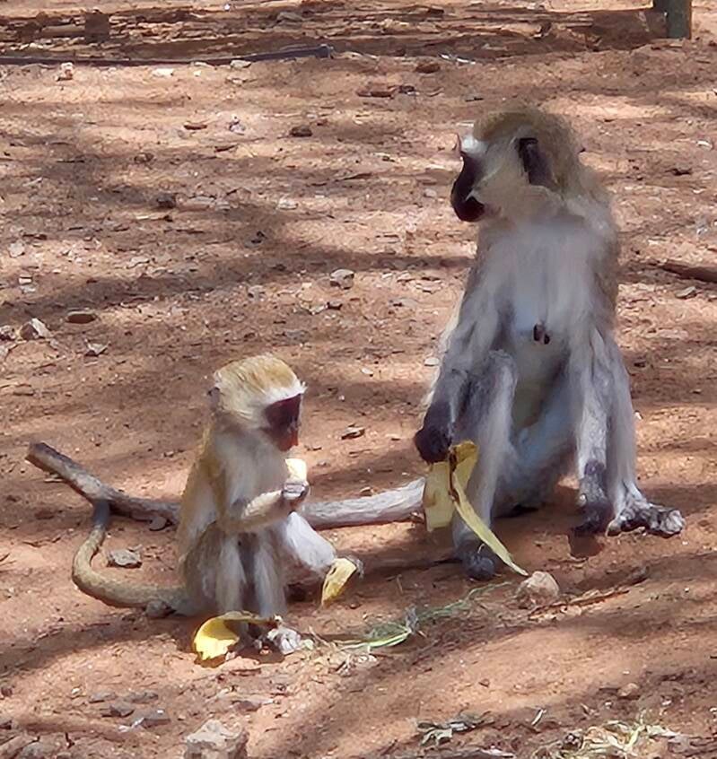 Mitte Nachmittag waren wir dann etwas erledigt. So viele Eindrücke und eine wahnsinnige Wärme. Es geht zurück zur Lodge. Auf dem Weg zu unserem Zimmer begegnen wir noch einer Pumbaa-Familie. Ein lautes Grunzen vom Papa... okee, was tun wir jetzt... stockstill bleiben wir stehen. Die Kids hauen ab, die Eltern folgen. Sehr gut, der Weg in unser Häuschen ist wieder frei. Und so sitzen wir jetzt gemütlich auf unserer Terrasse und beobachen auf Distanz die Affen, Zebras, Dic Dic und andere Antilopen. Ab und zu kommt ein Vervet-Affe zu uns und beobachtet uns frech. Sorry, wir haben nichts zu Essen.